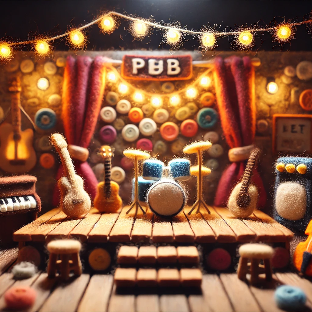 This cozy and colorful performance features dynamic electric guitar riffs, vivid drum beats, and a whole lot of charm—all brought to life in a warm, whimsical felt pub setting. From the tiny instruments to their knitted hats and cozy outfits, everything is crafted with love and imagination.